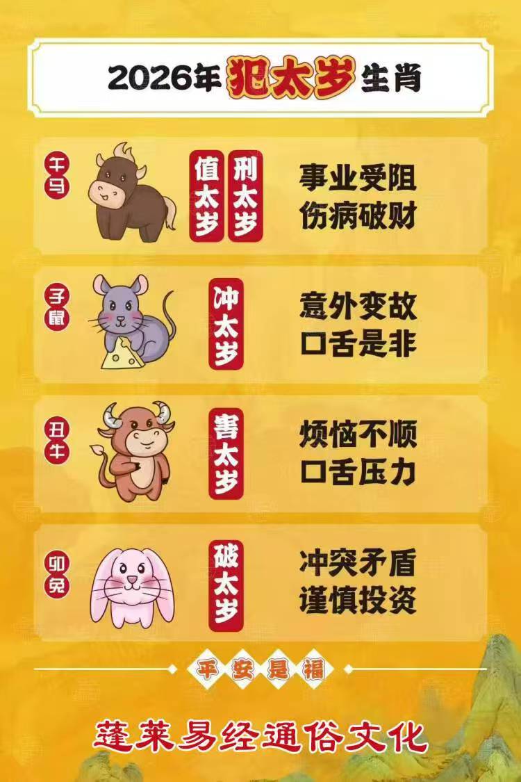 2026年为农历丙午年,太岁生肖属马,值守太岁星君为文哲星君。犯太岁的生肖包括马(值太岁兼刑太岁)、鼠(冲太岁)、牛(害太岁)、兔(破太岁),这些生肖在运势上可能面临挑战,可以通过传统方法化解。结缘热线:13668659263(微信同号)。